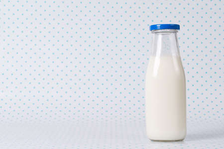 Bottle of milk with blue cap on polka dots background