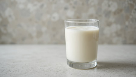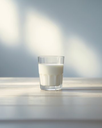 A refreshing glass of milk on a smooth countertop, set against a light, textured backdrop.