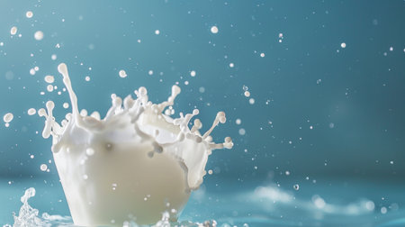 Close-up of a splash of milk with drops frozen in mid-air against a light blue background, capturing the freshness and fluid motion.