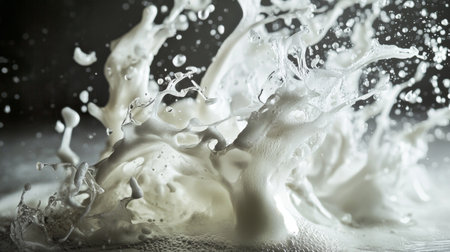 A high-speed capture of milk splashing in various directions, showing intricate textures and fluid motion. Perfect for themes of dairy, freshness, and dynamic photography.