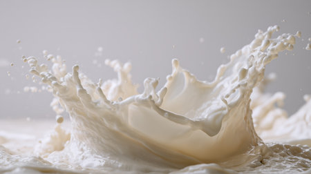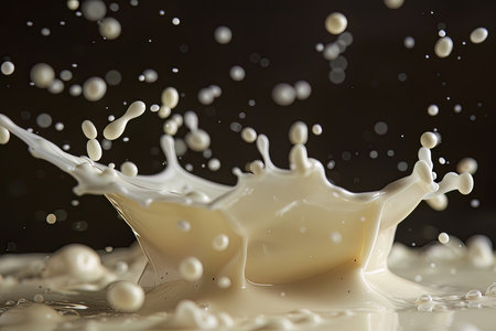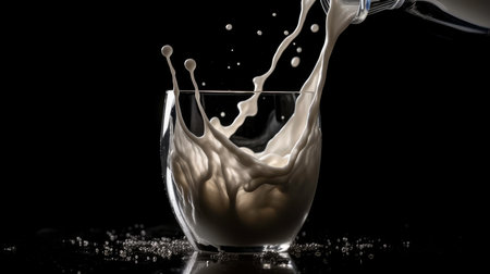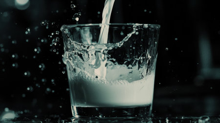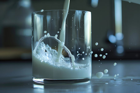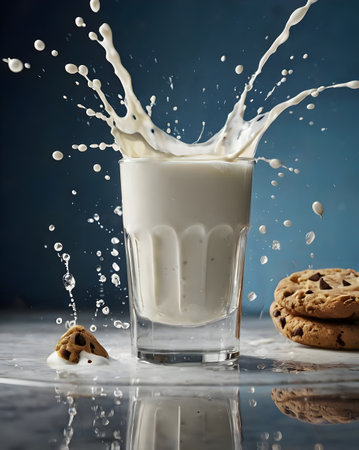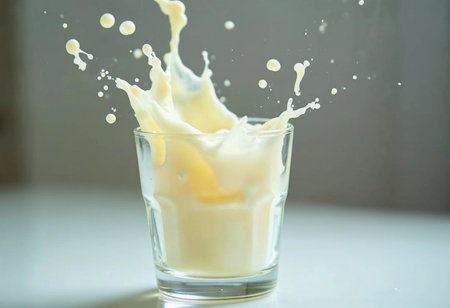 A glass of milk is poured into a glass, creating a splash. The splash is captured in a photo, and the image conveys a sense of movement and energy
