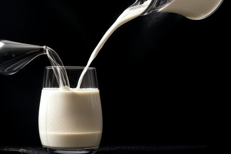 High quality image of milk pouring into glass, emphasizing texture and reflection