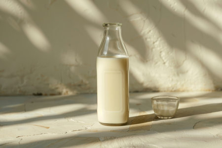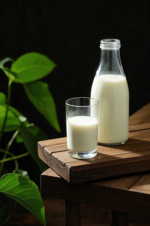 A stylish composition featuring fresh milk in a glass and a bottle, perfect for minimalistic kitchen decor. Ideal for healthy lifestyle themes.