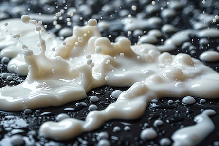 A close-up photograph of a white liquid splash on a black surface, with droplets and a smooth, abstract texture.