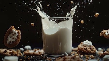 Fresh glass of milk with a splash spilling over the rim, surrounded by crumbs and cookies for a cozy snack-time scene