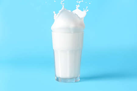 Glass of tasty milk with splashes on blue background