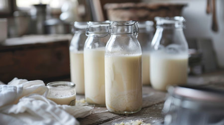 A close up of a glass bottle with milk in it, AI