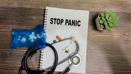 Concept of Stop Panic write on book isolated on Wooden Table.
