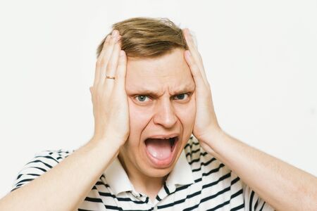 Portrait of a stressed young man with hands on his head isolated on white background