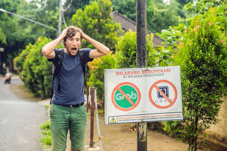 Young man looks at protest sign on a wall in Indonesian objecting to Uber and Grab taxi drivers reads 'Uber and Grab Taxis No Entry' in Ubud, Bali, Indonesia.