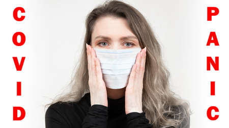 Words covid 19 no panic on a red background and a medical mask.