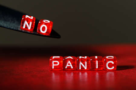 the word panic on red cubes on a red background, the word no has been added to the left. no panic hopeful concept