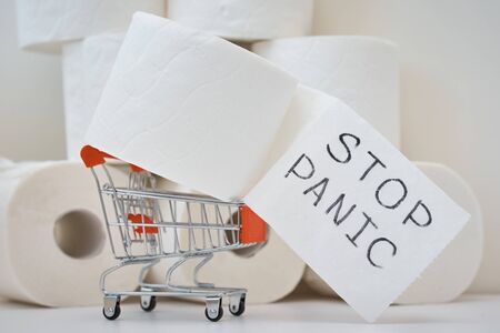 Consumer buying panic about coronavirus covid-19 concept. Toilet paper roll in shopping trolley with inscription stop panic. People are stocking up essentials for home quarantine
