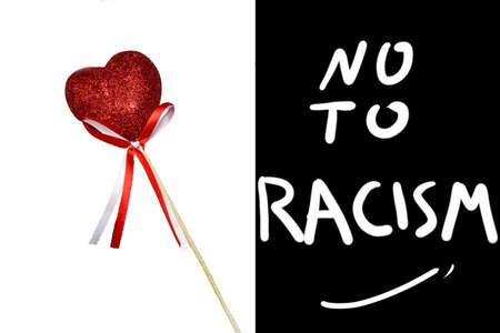 carton placard with say no to racism lettering on red background