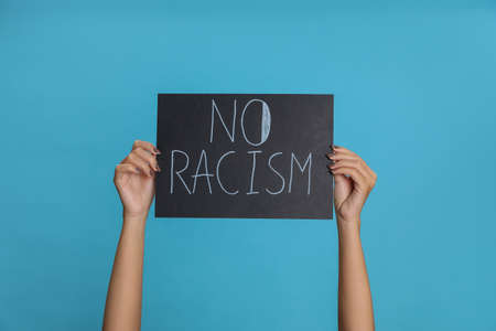 Woman holding sign with phrase No Racism on light blue background, closeup