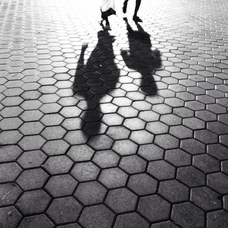 Light and shadows in New York City. Shadows of people walking street in morning light
