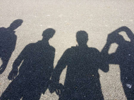 Shadows silhouettes of group of men standing on summer promenade in sepia black and white
