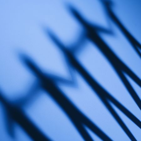 Four silhouettes stand quietly against a brightly lit concrete wall, creating a strong contrast. The scene has a dramatic and artistic feel, focusing on the play of light and shadow.