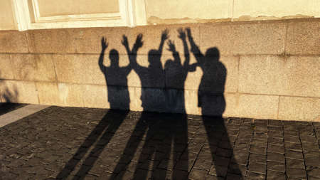 People, shadow and road of community in unity for achievement, winning or fitness together. Silhouette, group or active team in celebration for workout success, exercise or victory in city street