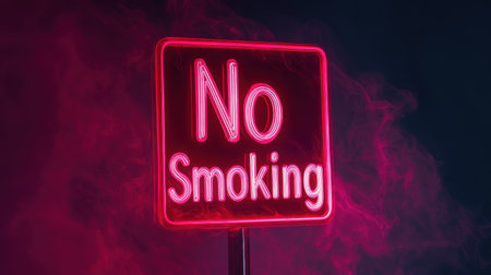 A striking pink neon No Smoking sign surrounded by a smoky atmosphere, perfect for promoting health awareness and creating a modern aesthetic in public spaces.