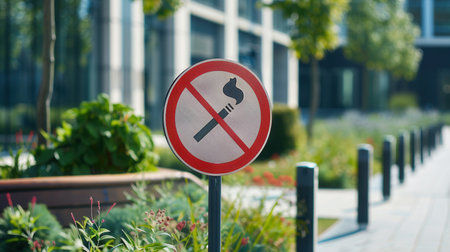 Bright red no smoking sign clearly visible in a vibrant park environment outside a modern office building, promoting a smoke free area.