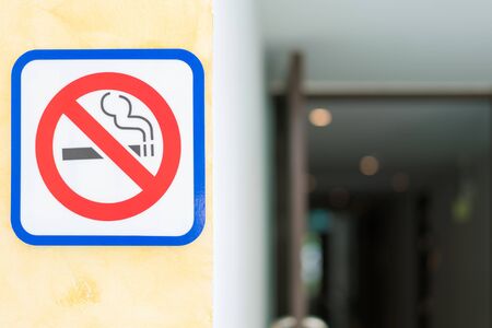 On the blue wall there is a white sign with an inscription prohibiting smoking. The concept of health and prohibition.