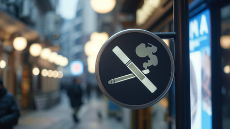 Vivid 'No Smoking' sign on a colorful street, promoting smoke-free environments and public health awareness.