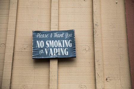 Close up of a grunge rustry No Smoking sign, outdoor infront of a restaurant background, selective focus.
