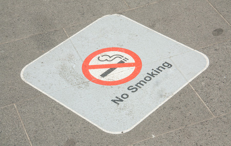 This is a no smoking area sign on posh looking street, marble pavement, and bottom walls of shops