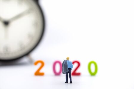 Business and 2020 New Year Planning Concept. Close up of businessman miniature figure people with jacket standing on white background and looking to colorful plastic number and vintage round clock with copy space.