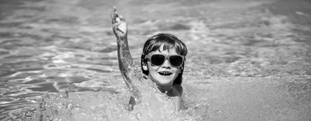 Happy kid having fun in swimming pool. Banner for header, copy space. Poster for web design.