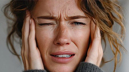Close-up portrait of a woman with curly hair, displaying emotions of stress and anxiety. She holds her head in hands against a neutral backdrop, illustrating vulnerability.