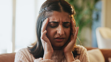 Woman, pain and headache of stress in home for financial crisis, mortgage debt or overwhelmed. Anxiety, person or tension migraine on sofa for overthinking, uncomfortable ache or dizzy for bankruptcy