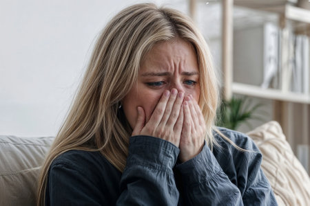 Face of sad woman is crying on a couch. She has her hands on her face and is holding her nose