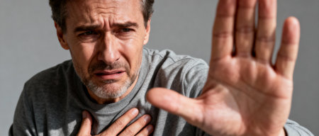 Middle aged man showing fear and anxiety with hand raised in defense and distressed facial expression against neutral background.
