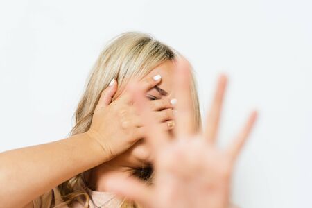 Preventing violence against women, All talk and no action. Victim of domestic violence, Human trafficking concept, End to violence against women,Scared woman with man's hand covering her head, Sexual violence against women