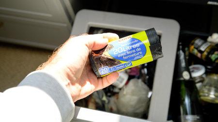 sustainable living conceptual still-life, Reduce plastic use message with wooden peg on top of plastic bags