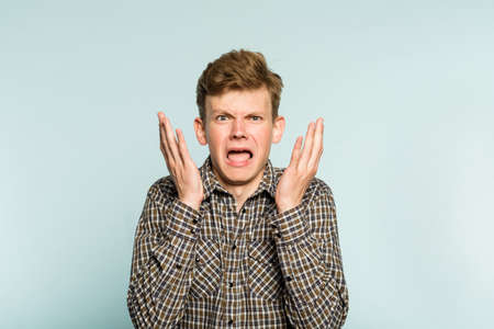Young teen boy in blue hoodie standing, shouting and ready to defend himself with fists over pastel blue wall background. Stylish casual clothing for teenagers and emotions diversity concept