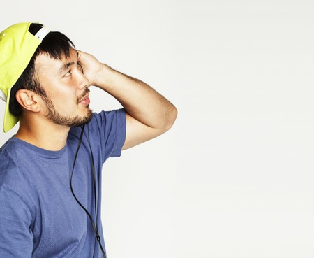 Attractive beautiful smiling positive asian happy man. Closeup portrait asian laughing man wearing gray t-shirt isolated on white background.