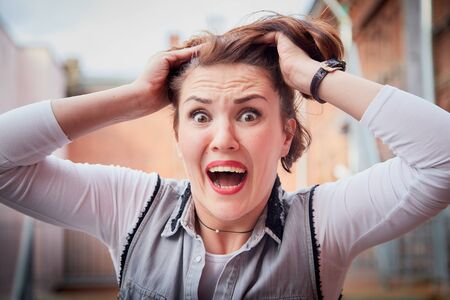 Portrait of two stressed colleagues, Caucasian businessman and Asian businesswoman, standing holding head in hands, looking at camera and screaming