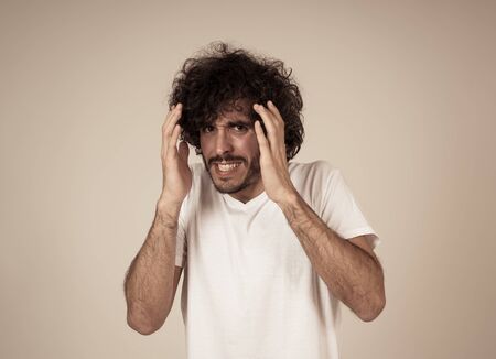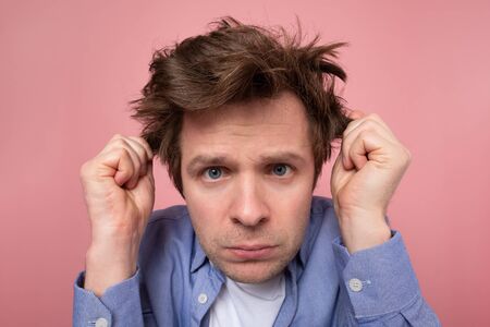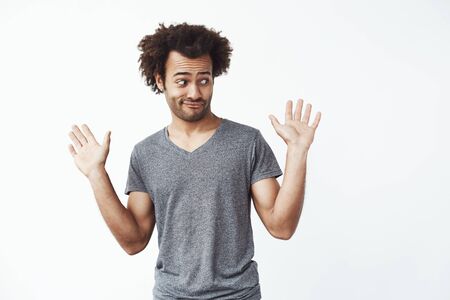 Photo closeup of uptight caucasian man with afro hairstyle frowning at camera with sad look isolated over gray background