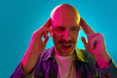Portrait of young bald man with moustache standing with thoughtful concentrated face against blue studio background in neon light