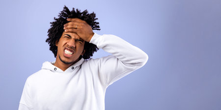 African American teenager suffering from headache, touching his forehead over violet studio background