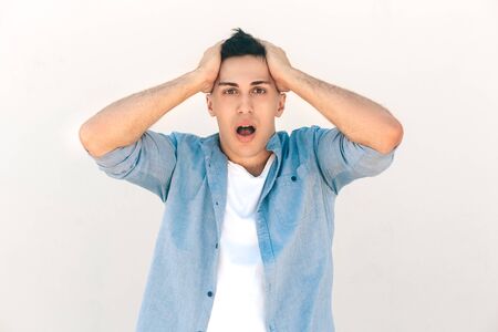 Outdoors Leisure. Stylish guy standing isolated on white holding head mouth opened shocked