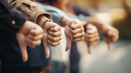 A group of people stands together with their arms extended, each person making a thumbs down gesture. The setting is outdoors and the sunlight is bright.