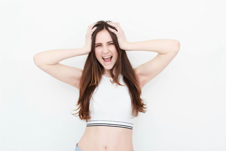 Beautiful young girl unhappy frowning and shouting on gray isolated background
