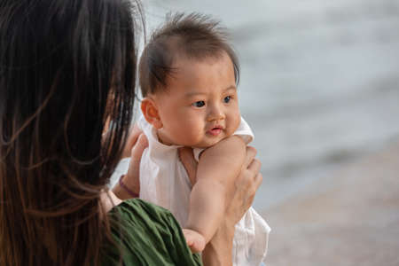 Happy cute baby boy with his mother on the beach. Summertime with baby is a quality time for Asian mommy. Mother and baby on the beach and happy morning moment. Motherhood love and care for her child