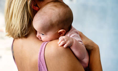Four months old infant on her mother hands, detail on his face and blue eyes