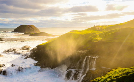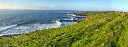 Panoramic view from Northern Ireland shoreline to the sunset ocean. Amazing landscape. The grass covered land next to the sunlit ocean water. Beauty of the wild Irish nature under the sun lights.
