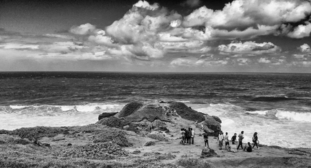 View of the Pointe de la Varde with the cloudy sky and the sea crashing against its rocks.